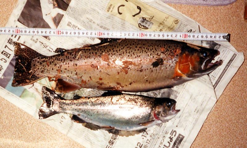 05年11月10日21:36 - 2.NAMIHEI陸封型をニジマスまたは、レインボートラウト(Oncorhynchus mykiss)と言い、降海型をテツガシラまたは、スチールヘッド(Oncorhynchus mykiss)と言う。
